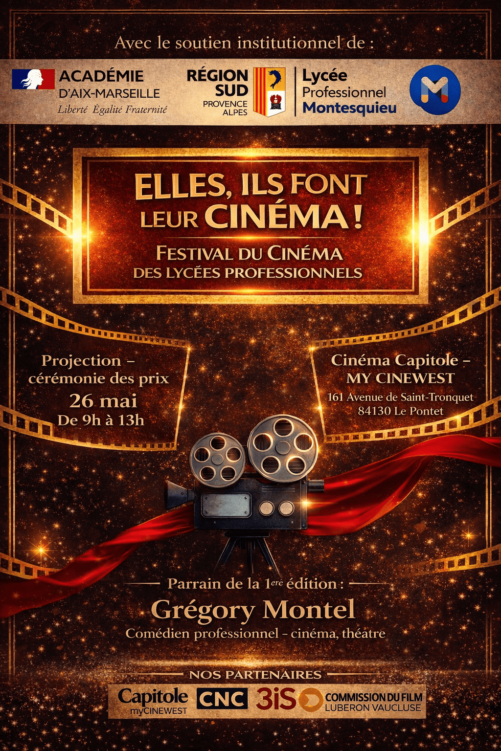 La délibération du jury aura lieu le 27 avril 2026 à l’École supérieure des arts à Aix-en-Provence. La cérémonie de remise des prix se déroulera le mardi 26 mai 2026 au cinéma Capitole My Cinewest au Pontet.